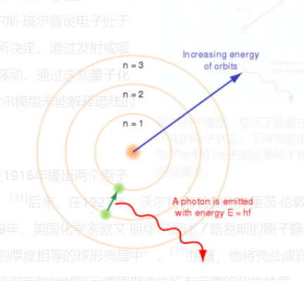 图 4:玻尔原子模型,显示了能量由 n 所量子化的电子状态。下降到较低轨道的电子发射的光子的能量等于轨道之间的能量差。