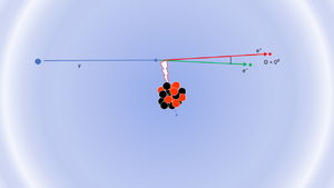 图 14:电子和正电子的成对产生,由光子接近原子核引起。闪电符号代表虚光子的交换,因此电力在这里起作用。粒子之间的角度非常小。[1]