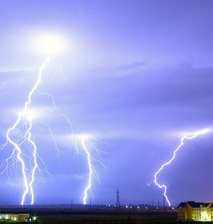 图 12:闪电放电主要由电子流组成。[53]闪电所需的电势可以由摩擦电效应产生。[54][55]
