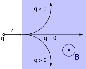 图 9:带电荷 q 的粒子(在左边)以速度 v 通过指向读者的磁场 B。对于电子来说,q 是负的,所以它沿着弯曲的轨迹向上移动。