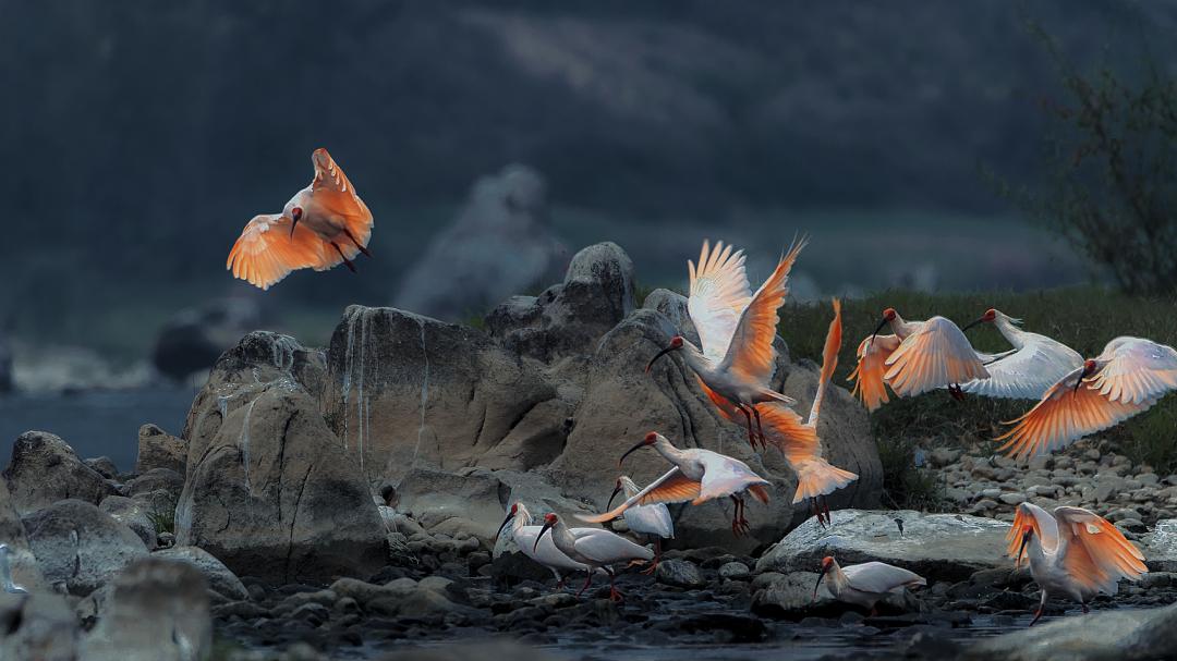 △惬意飞翔的朱鹮。(图/视觉中国)