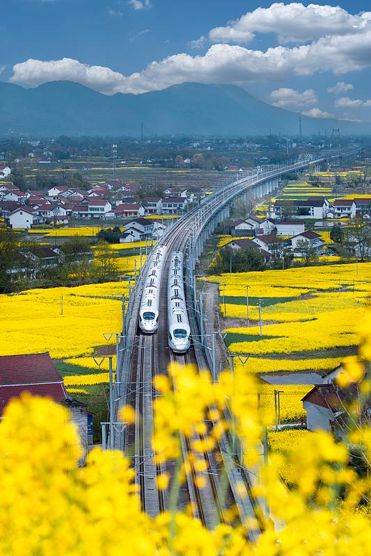 南郑区陈村花海种在山间,紧邻水库,在此不但能欣赏山水间充满层次感的油菜花田,坐在湖边赏花野餐也是上乘之选;岳家岭村观景点则可俯瞰村庄与花田,还能看到高铁穿花而过。不知坐在“开往春天的列车”里的人,是否能在黄灿灿的花丛中与春天打个照面?