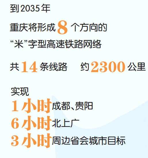 到2035年,重庆将建成联通亚欧、通达全国、畅通周边的铁路战略通道;形成以重庆枢纽为中心,“米”字型高速铁路通道为骨架,“两环十一干线多联线”普速铁路为基础,快捷融合的城际和市域铁路为支撑的现代化铁路网络体系,实现“区区通高铁、县县通铁路”。