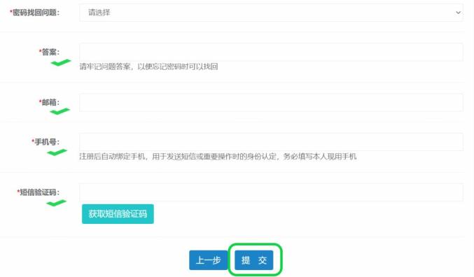 选一个熟悉的问题填写,并牢记问题答案,以便忘记密码时可以找回。信息确认无误后,点击“提交”。