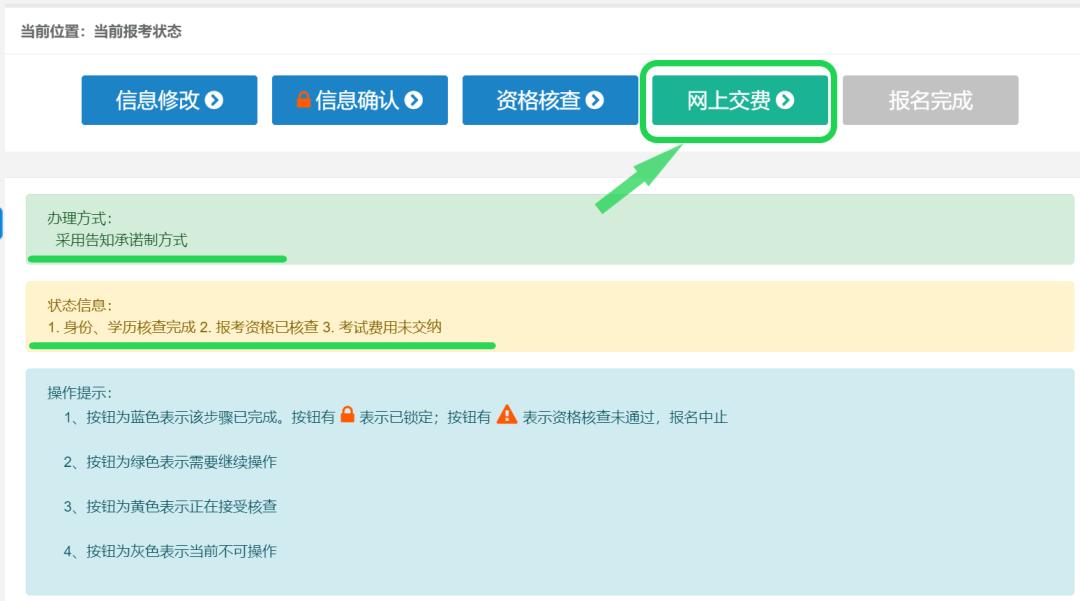 9.网上缴费。报名成功后会显示流程进度,需要在规定时间内及时缴费。学历系统验证通过的不用去现场审核,直接点击“网上交费”进入缴费;没有通过的要进行现场资格核验,只有等人工审核通过后才能缴费。缴费前可以进行报名信息修改。