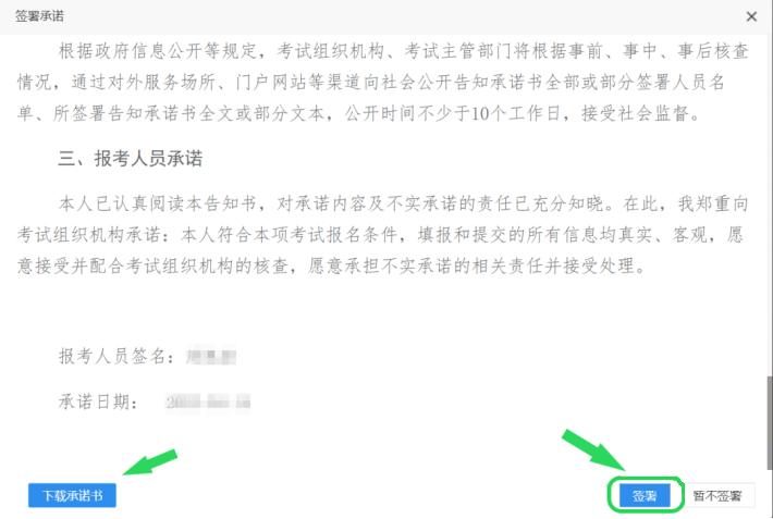 8.签署承诺书。点击“签署”,学历核查系统没有通过的,可以点击“下载承诺书”打印,和其他资料一起带到现场验证。