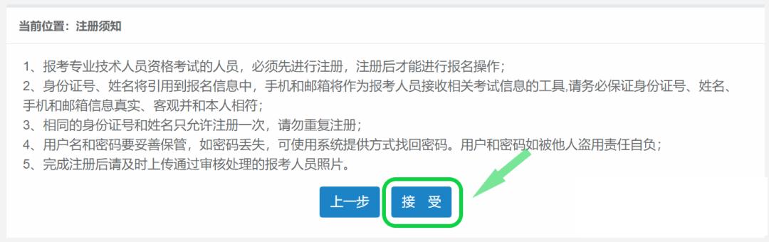 阅读“专业技术人员资格考试网上报名协议”,拉到最后点击“接受”。