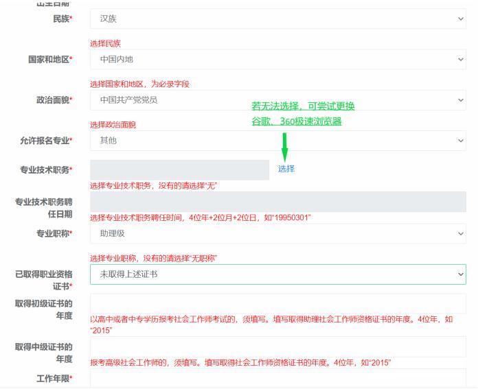 (12)工作年限必须大于等于专业年限。这里的专业年限是指从事社会工作的年限,需要符合之前选择的报考条件。如,报考条件选择“取得其他专业大专学历,从事社会工作满4年”,就必须填写不少于4年的专业年限。
