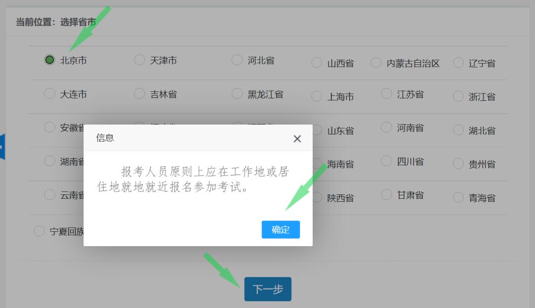 2.就近选择报考省份(以北京为例),点击“下一步”。