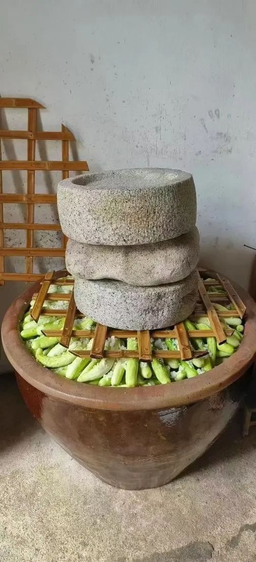 阿叔搬出一口大陶缸,用水洗净后倒扣起来,待缸中水滴沥干,阿婶将黄瓜和上盐,在缸中搅拌均匀,然后用扁平的石块或闲置的磨盘将黄瓜压住。阿婶说,接下来几天如果还有新的黄瓜需要腌制,只需挪开石块,将新的黄瓜和上盐,置于缸底,将前一日的黄瓜覆于其上,加上压石即可。由于是夏天,腌制黄瓜用盐量较多,故而腌黄瓜相对会比较咸,在腌制过程中,随着黄瓜不断出水,缸中容易“出花”,也就是起泡沫,阿婶说每天都需要“撩花”,也就是将泡沫撩尽,否则黄瓜容易作酸。