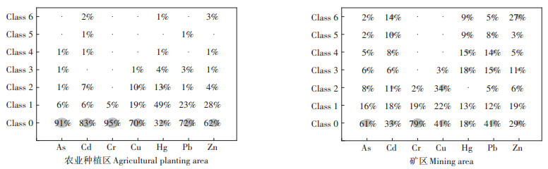 将各分区土壤重金属含量与《土壤环境质量农用地土壤污染风险管控标准(试行)》(GB 15618—2018)规定的筛选值和管制值分别进行比较()得出,自然背景区土壤重金属含量除Cd元素有两个样点超过筛选值外,其他均无超标。农业种植区As、Cd、Cu、Hg、Pb和Zn元素均超过筛选值,其样点超标率为10.20%、59.29%、7.95%、1.20%、5.41%和13.04%,其中As、Cd、Hg和Pb分别有2.04%、5.36%、1.20%、0.91% 的位点超过管制值。矿区土壤As、Cd、Cr、Cu、Hg、Pb和Zn的管制值超标率为39.34%、91.67%、7.55%、34.38%、20.37%、45.95% 和55.56%,其中As、Cd、Hg和Pb分别有14.75%、38.89%、16.67% 和16.22% 的位点超过管制值。整体上,农业种植区和矿区土壤样点中As、Cd、Pb和Zn超标率均相对较高,对土壤生态环境具有潜在风险,需要严加管控。