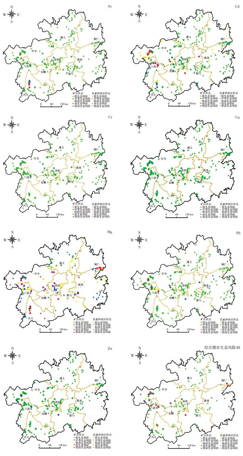 (3)从分区来看,重金属综合潜在生态风险表现为矿区>农业种植区>自然背景区。农业种植区和矿区土壤中Hg、Cd、Pb和As是主要的致险因子。矿产资源集中分布的地区生态风险较高,尤其是毕节地区、六盘水市和铜仁地区的Pb、Cd和Hg需严加管控。