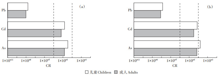 图 6 农业种植区(a)和矿区(b)重金属的致癌风险值(CR) Figure 6 Carcinogenic risk values (CR) of heavy metals in agricultural planting areas (a) and mining areas (b)