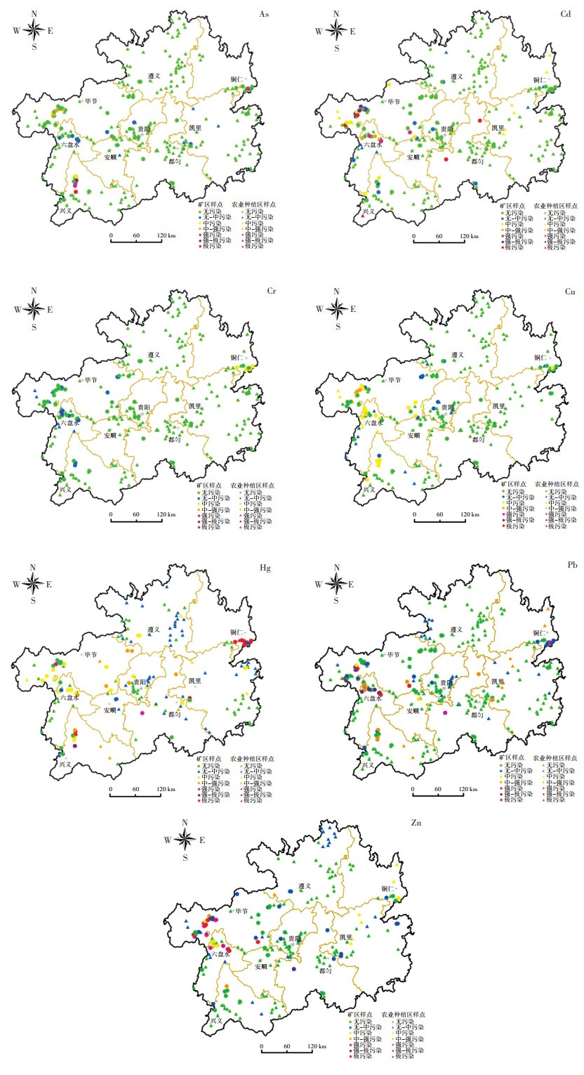 图 2 农业种植区和矿区地累积指数(Igeo)样点分布图 Figure 2 Sample points distribution map of accumulation index (Igeo) in agricultural planting area and mining area
