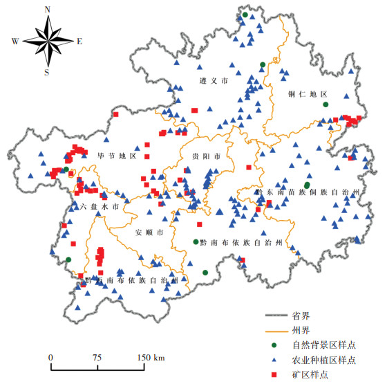 本研究以CNKI全文数据库及Web of Science数据库为基础,检索时间从2009年至2020年3月。依据文献不重复、与主题相关且为学术论文的原则进行检索,收集整理了贵州省近10年与土壤重金属有关的160篇论文中表层土壤(20 cm以内,包括0~20 cm或0~15 cm或0~10 cm)的重金属含量数据,涉及126篇中文文献和34篇英文文献。为了进行分析、比较,将数据单位统一换算为mg·kg-1,并依据土壤的主要用途进行分区,将林地、草地、河流流域等未受明显污染地区归为自然背景区(样点n=10),主要分布在贵州梵净山自然保护区及省内的植物园、森林公园等林地;将农用地如果园、茶园、蔬菜基地等农作物种植区归为农业种植区(样点n=124),主要集中在贵阳市水果蔬菜种植园,毕节、遵义等地烟草种植基地,都匀、遵义等地的茶园,以及黔东南中草药种植基地;将受矿山开采影响的矿区周边土壤归为矿区(样点n=91),主要分布在铜仁万山、黔西北铅锌冶炼区、黔西南兴仁晴隆、都匀牛角塘、黔东南丹寨等地,矿产资源以铅锌矿和汞矿为主。不同分区土壤样点分布见。