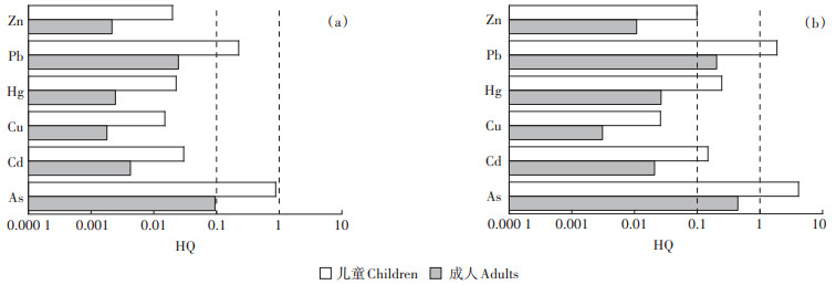 图 5 农业种植区(a)和矿区(b)重金属的非致癌风险商(HQ) Figure 5 Non carcinogenic risk index (HQ) of heavy metals in agricultural planting areas (a) and mining areas (b)