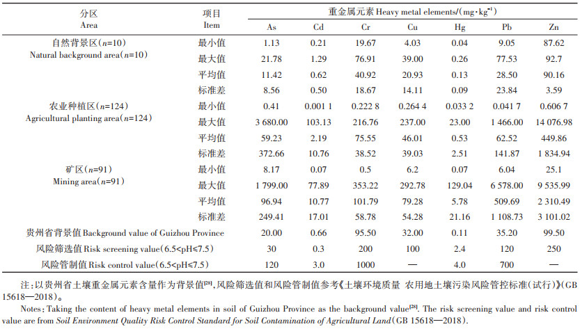 贵州省土壤重金属含量统计见,不同分区表层土壤重金属含量水平差异较大。自然背景区土壤中各重金属含量均与贵州省土壤背景值相差不大,主要因为自然背景区土壤土地利用类型为林地、草地,受人为活动干扰较小,土壤重金属含量主要受成土母质影响[]。农业种植区土壤中除Cr外,其余重金属含量平均值均超过贵州省土壤背景值,其中As、Cd、Hg和Zn含量较高,分别是土壤背景值的2.96、3.32、4.82倍和4.52倍。农业种植区土壤中重金属含量高主要与汽车尾气排放、农用物资投入与地质背景的共同作用有关[]。此外,农业种植区的部分样点分布在矿区下游,地表径流过程也是导致矿区周边农业区重金属含量累积的原因之一[]。矿区土壤中各重金属含量平均值均远高于贵州省土壤背景值,As、Cd、Cr、Cu、Hg、Pb和Zn分别是土壤背景值的4.85、16.32、1.07、2.48、52.55、14.48倍和23.22倍,存在不同程度的累积,尤以Cd、Hg、Pb、Zn最为突出,主要与贵州矿产资源分布及矿产资源开发有关[]。Pb和Zn超标土壤集中分布在黔西北地区,与该区域铅锌矿的冶炼密不可分。铜仁市万山区土壤中Hg累积较显著,贵州东部土壤样点Cd、Pb和Zn累积程度相对较高,主要与该区域铅锌成矿带分布有关[, ]。贵州矿产资源分布较广,长期的矿产资源开发、冶炼产生的废气、废水导致重金属进入矿区周边土壤,从而引起土壤中重金属的的累积。