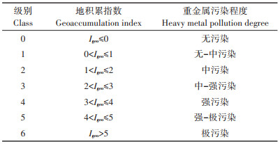 地累积指数(Geoaccumulation index,Igeo)是用以定量描述土壤、沉积物中重金属污染程度的指标[]。计算公式如下:
