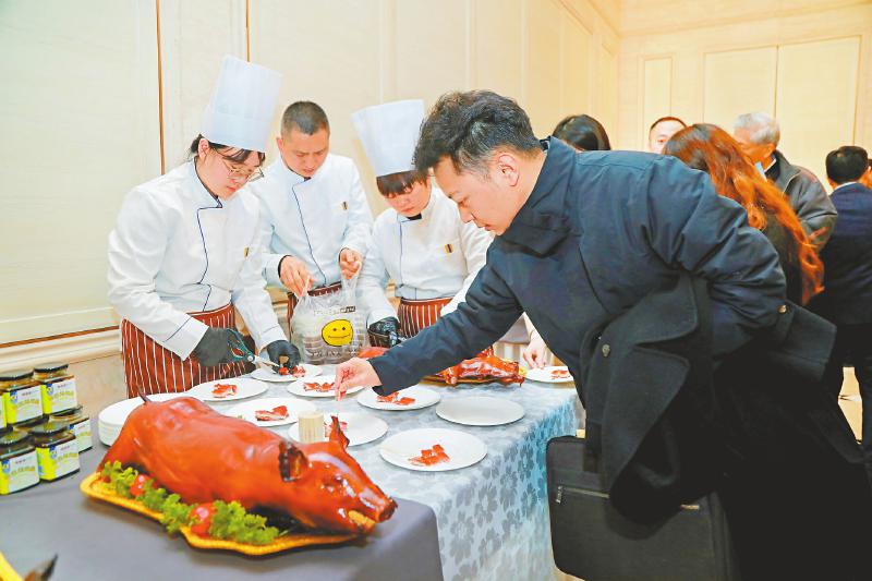 “四川藏香乳猪出口香港”首发仪式,嘉宾品尝烤乳猪。四川睿禾亮农业科技发展有限公司供图