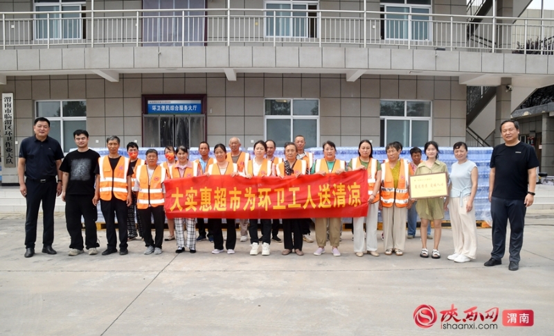 【临渭区爱心企业捐赠万瓶冰露水 为高温下的环卫工送清凉】7月22日,临渭区环卫中心举行爱心捐赠仪式,临渭区大实惠超市向一线环卫工作者捐赠780件、共18700余瓶水,为高温下坚守的劳动者送上清凉。临渭区环卫中心为企业回赠牌匾致谢。