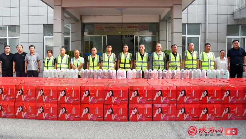 7月22日,临渭区总工会为奋战在一线的环卫工人集中发放400份慰问物资。记者 郝豆 摄