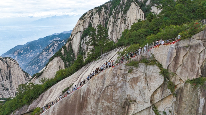 7月23日,无人机航拍的游客在华山苍龙岭攀登游览。