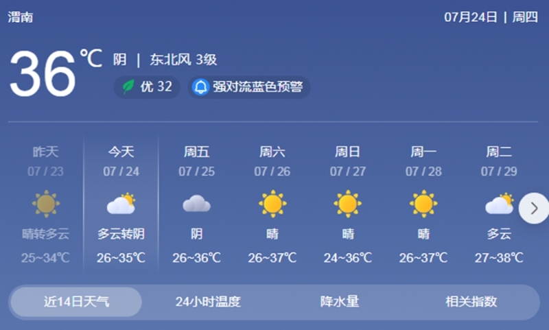 【未来十天渭南市有持续性高温 需做好能源保供和防暑降温等工作】受副热带高压影响,预计7月24日至8月3日,渭南市有持续性高温天气。高温最强盛时段为7月27至28日、30日,中南部平川地区和黄河沿线局地最高气温可达39℃以上。受热力不稳定影响,午后局地易出现短时暴雨、雷暴大风等强对流性天气,短时暴雨具有点强点散、致灾风险高等特点,需密切关注最新的短时临近预报预警信息。