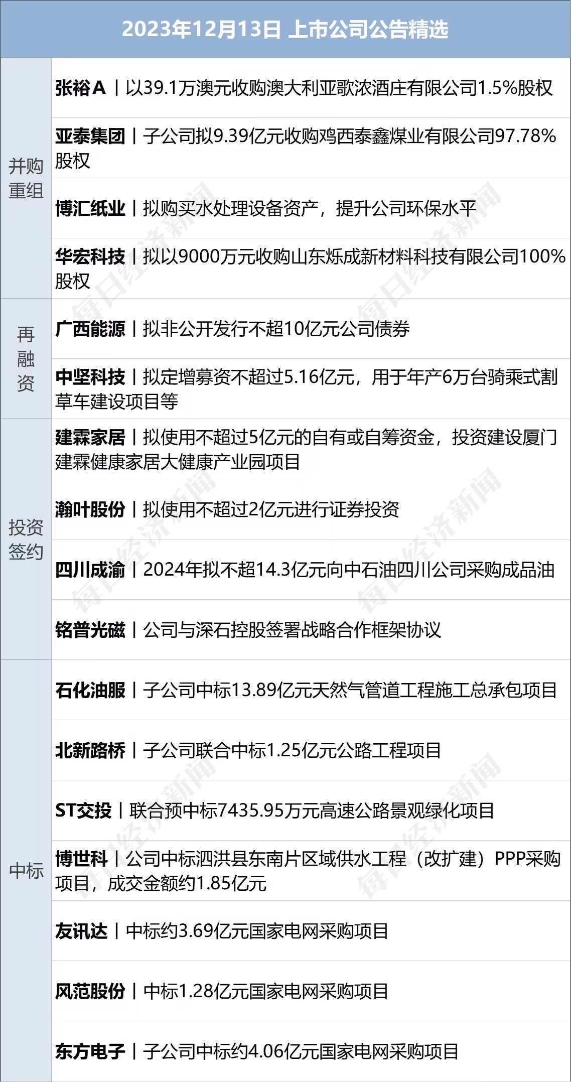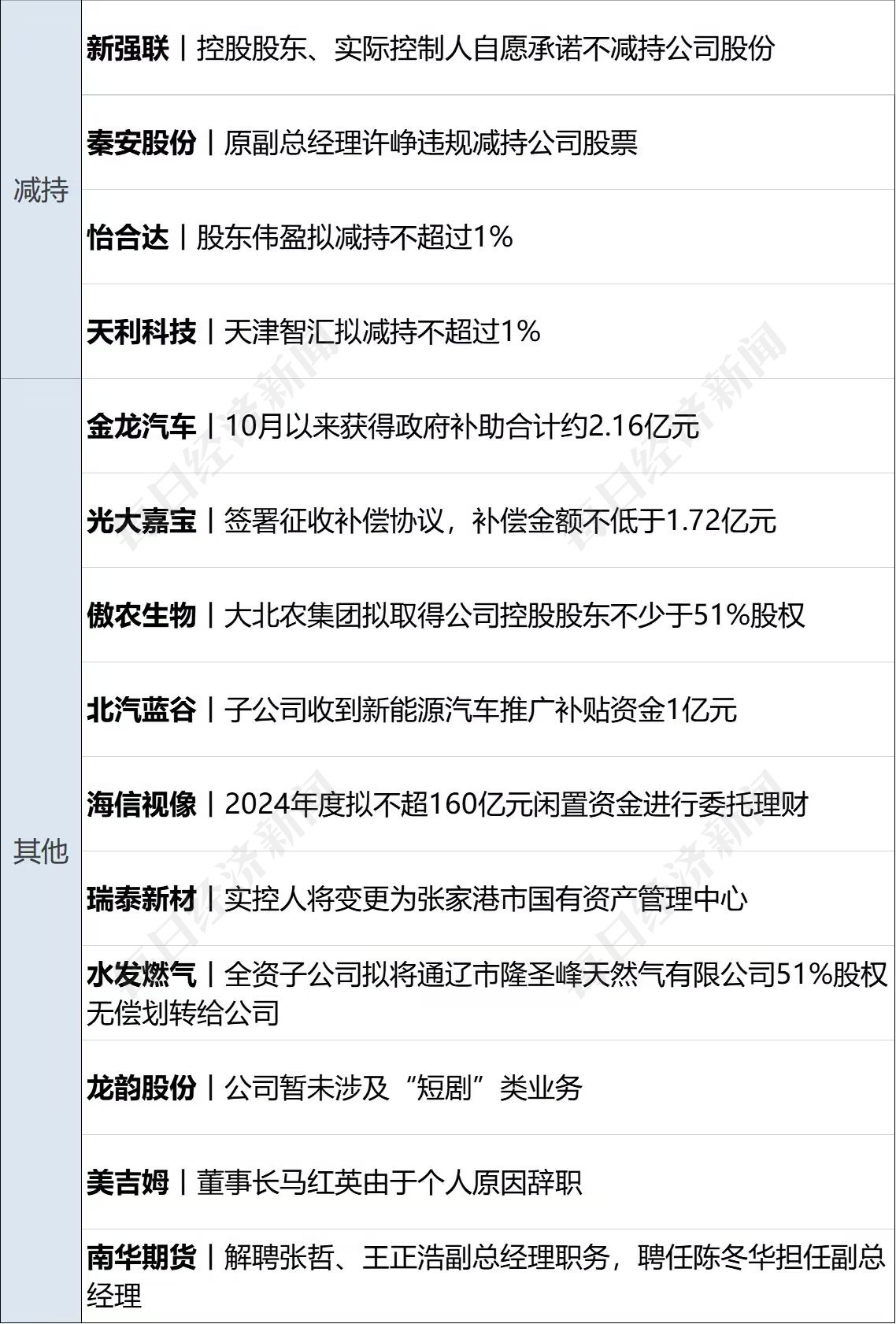 万达电影(SZ002739,股价12.45元,市值271亿元):12月12日晚,万达电影公告,公司间接控股股东万达文化集团及其全资子公司北京珩润、公司实际控制人王健林与儒意投资签署了《股权转让协议》,拟将其合计持有的公司控股股东万达投资51%股权转让予儒意投资,转让价款共计21.55亿元。若上述事项最终实施完成,公司实际控制人变更为柯利明。公司股票自2023年12月13日开市起复牌。