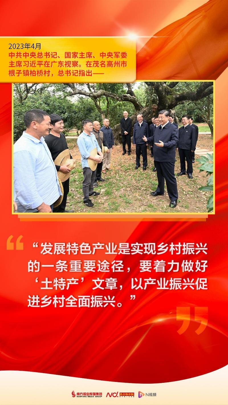2023年4月10日至13日,习近平总书记在广东视察。在茂名高州市根子镇柏桥村,总书记指出,“发展特色产业是实现乡村振兴的一条重要途径,要着力做好‘土特产’文章,以产业振兴促进乡村全面振兴。”