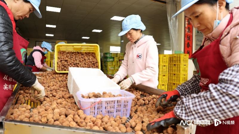 柏桥村的一个产业园内,工人在分装荔枝干。