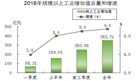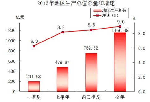 实现生产总值1156.49亿元,按可比价格计算,增长9.0%;其中,第一产业增加值205.74亿元,增长4.5%;第二产业增加值495.03亿元,增长10.7%;第三产业增加值455.72亿元,增长9.1%。人均生产总值33597元。非公有制经济增加值占生产总值比重为51.5%;战略性新兴产业增加值增长12.5%。
