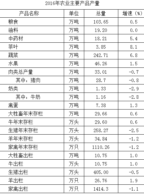 粮食播种面积399.42万亩,比上年减少1.66万亩;粮食总产量103.65万吨,增长0.5%。其中:夏粮26.24万吨,秋粮77.41万吨。油料种植面积125.87万亩,比上年减少0.09万亩。