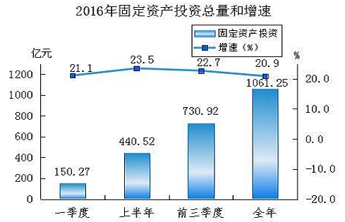 全社会固定资产投资完成1209.89亿元,比上年增长24.5%。其中,固定资产投资完成1061.25亿元,增长20.9%。亿元以上重大施工项目178个,较上年增加65个,亿元以上项目完成投资353.36亿元,增长93.9%。