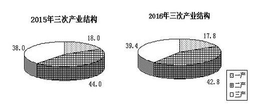 地区生产总值中,第一、第二和第三产业增加值占比分别为17.8%、42.8%和39.4%。与2015年相比,第一产业占比下降0.2个百分点,第二产业占比下降1.2个百分点,第三产业占比提高1.4个百分点。