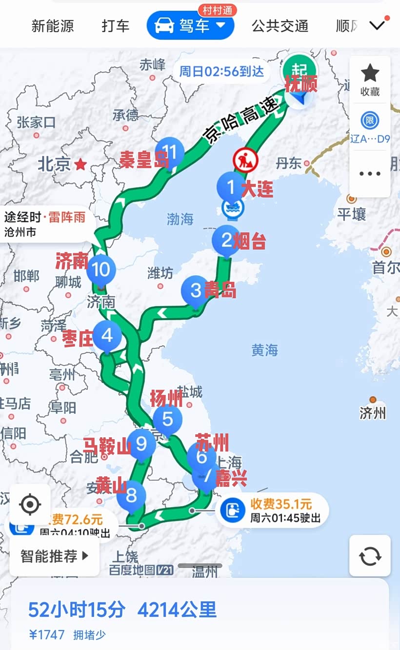 总结及感悟:上半段历时12天共行驶2100公里,游览了辽宁、山东、江苏、浙江4个省份多个5A级景区,我们出发前就已商量好,尽可能多游览5A级景区,这才是一个城市的精华。有的车友可能会问,你们走的这么急,还没有深度游玩就离开了,不遗憾吗?说真的,我没觉得遗憾,因为工作原因,能请20多天假已经是上限了,在有限里时间里做到“我来过”已经不容易,确实无法深度旅游。另外,这种打一枪换一个地方的旅游方式,真的很耗体力,我既要当司机,又要当导游,每晚基本在23点以后睡觉,真的很辛苦。真不知道过几年还能不能开得动,趁着体力还行,让我们继续出发吧!