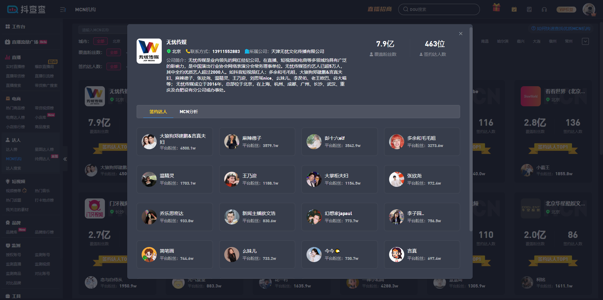 2.详情可查看MCN机构的联系方式公司简介。下方展示机构签约达人信息和所有签约达人的粉丝分析,助您精准分析机构达人面向群体的用户画像,从而定位机构达人的整体调性。