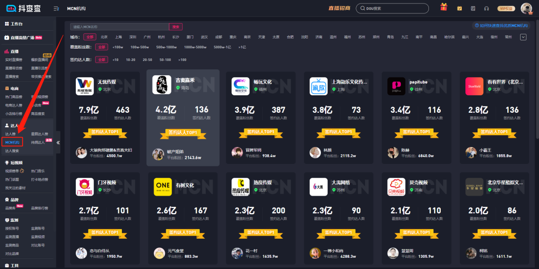 1.在【MCN机构】中可以根据城市覆盖粉丝数签约达人数筛选对应条件的机构。并查看对应的达人及覆盖粉丝数据。如下方列表的第一个MCN机构“无忧传媒”,粉丝量及热度最高的达人是“大狼狗郑建鹏&言真夫妇”,机构旗下所有达人的粉丝覆盖数为6.1亿,签约达人305个,点击可查看机构详情。
