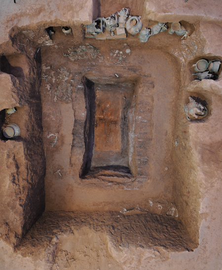 其中,M3有6个壁龛,5个内出土青铜礼器14类31件,计有鼎、簋、卣各6件,禁、斗各2件,甗、彝、罍、壶、尊、觯、盉、爵、盘各1件;M4壁龛8个,出土青铜礼器11类50件,包括簋16、鼎15、罍、甗各4,壶、簠、盂、牺尊各2,甑、尊、盘各1件。两墓北壁西端壁龛各出1件高领袋足鬲。另,M3二层台及椁室顶部随葬有兵器、车马器及其它小件遗物。棺内均随葬有少量玉器。此两墓相距不远,墓向一致,规模相若,形制相同,出土器物种类与摆放位置接近。凡此表明,两座墓葬的关系密切。而且,两墓均出土见“臣辰先”铭文铜器,更进一步支持这一判断。