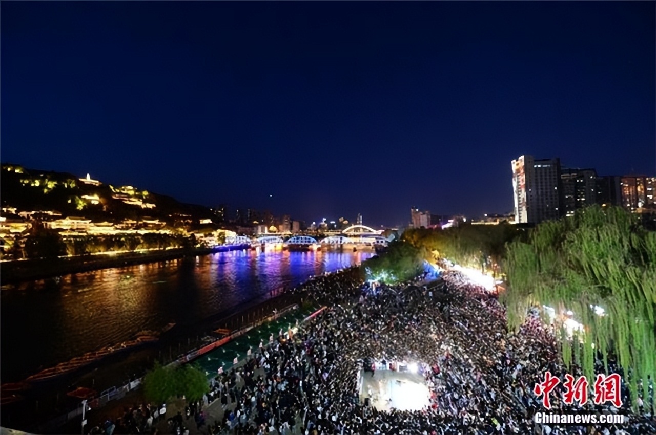 夕阳西下,夜幕降临时分,黄河岸边的广场上“黄河大合唱”响彻夜空。图/视觉中国