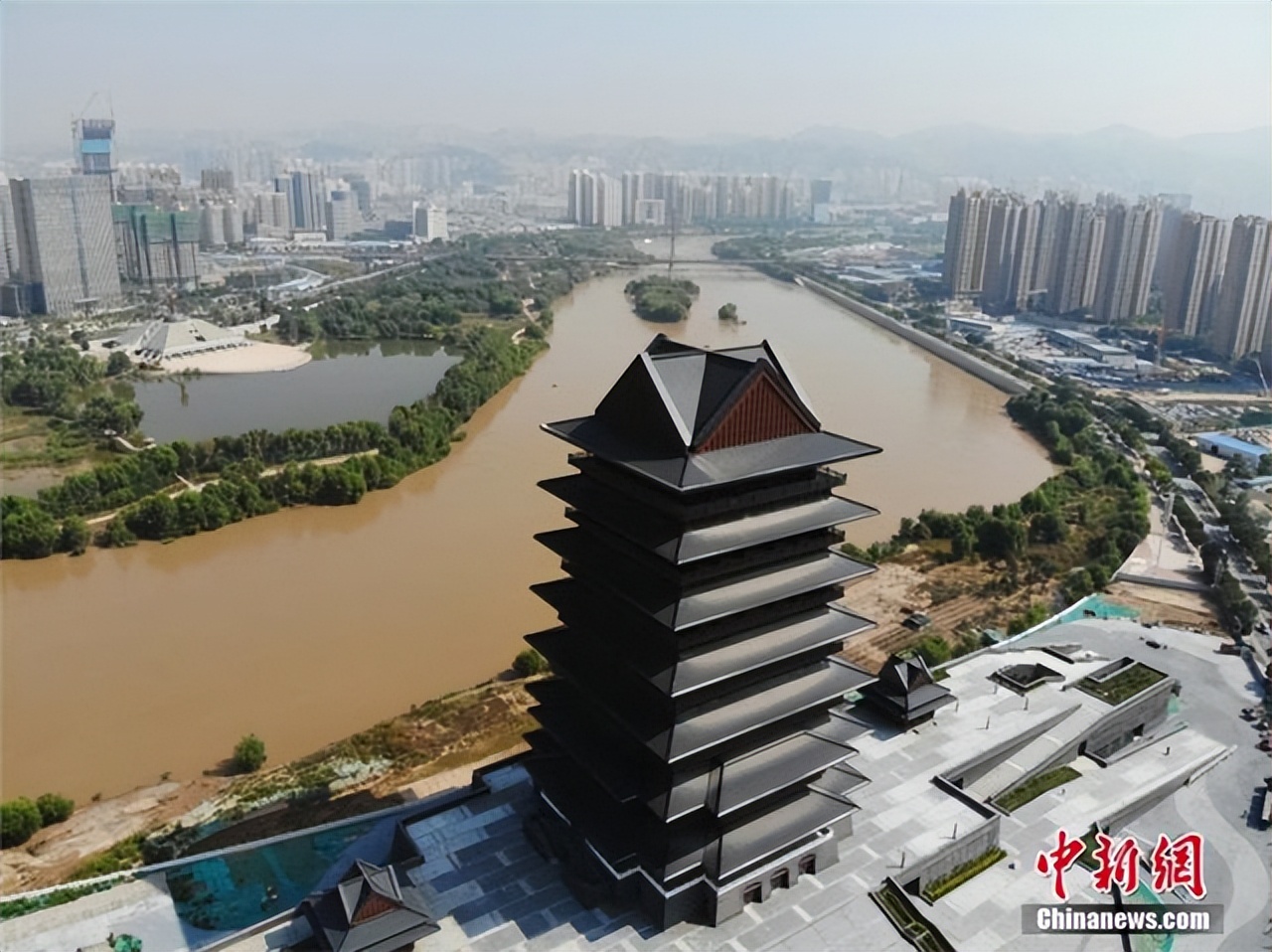 黄河楼位于黄河兰州段大拐弯处的七里河区马滩开发区,主楼为明七暗六的塔式结构,地面建筑高度为93.39米,共16层。据记载,古代兰州早在唐朝前期,在黄河边上就有一座雄伟的黄河楼,一直延续到明清。中新社记者 杨艳敏 摄