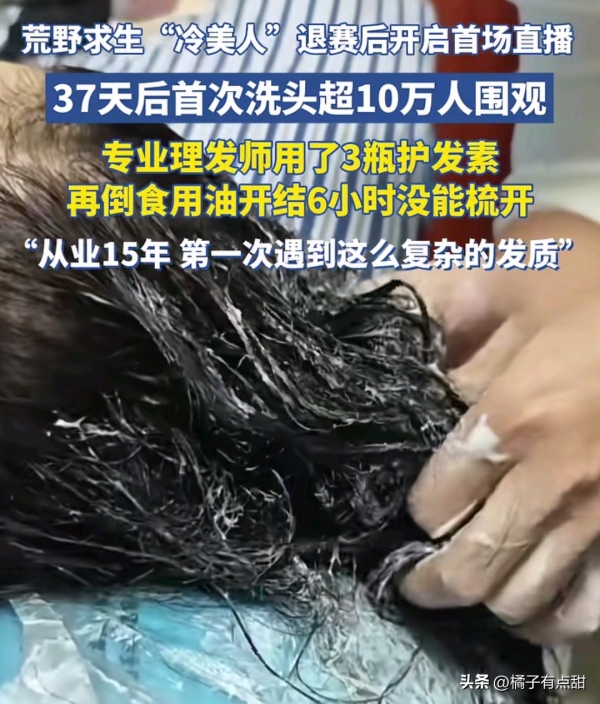 冷美人退赛后开启了第1场直播,表示想保留自己的一头秀发,还在评论区问大家有什么好的办法?没想到一时间,居然引来10万人围观……专业理发师用了三瓶护发素,再倒上食用油开结,直到6个小时后依然无法梳开。