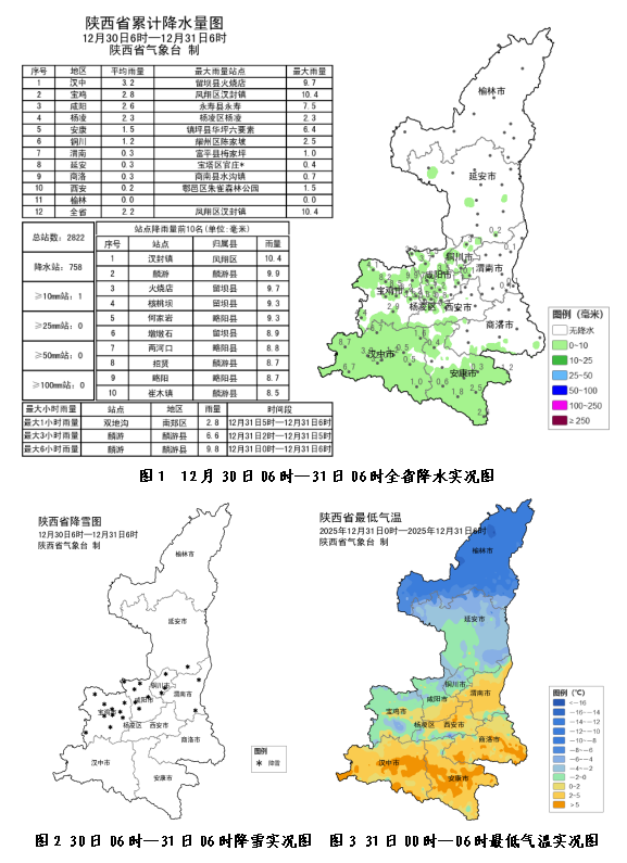 30日06时—31日06时延安局地、关中西部、陕南西部及南部共有68个区县758个监测站出现降水,其中延安东南部局地、关中大部22个区县出现雨夹雪转小到中雪,宝鸡中北部、咸阳北部大雪,其余小雨,降水量最大凤翔汉封镇10.4毫米;城区最大0.8毫米(灞桥区惠东观测站)(图1、图2)。