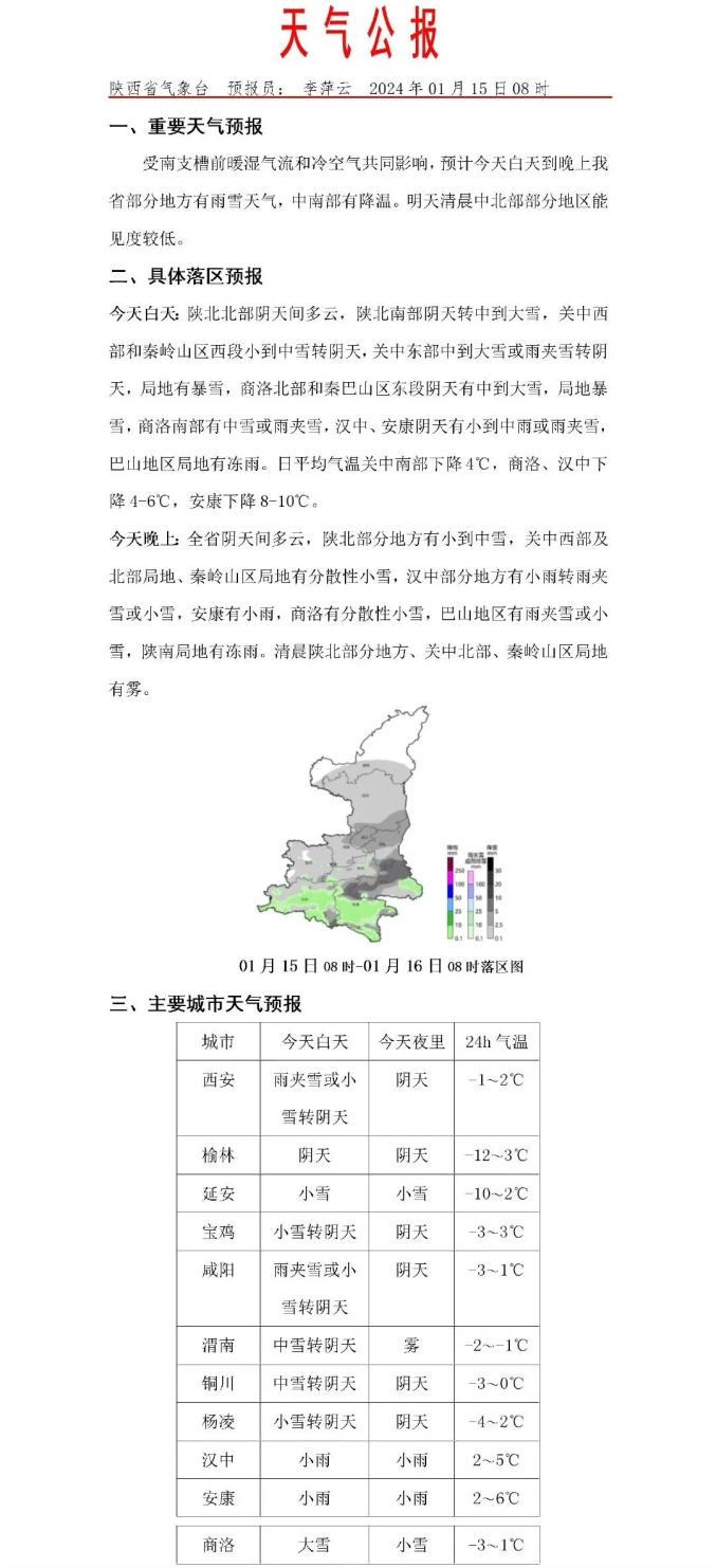 榆林北部阴天,榆林南部、延安大部有小到中雪,铜川、宝鸡、咸阳、杨凌、西安、渭南、商洛有雨夹雪或小到中雪,其中渭南东部部分地方、商洛部分地方、秦岭山区东段部分地方有中到大雪,汉中、安康有小到中雨或雨夹雪。巴山部分地区有冻雨。