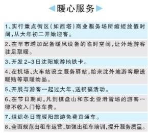 随着沈阳文旅市场的蓬勃发展,特别是农历小年、春节临近,外地来沈游客数量呈快速上升的良好态势。为充分展示沈阳人热情友善、包容大气、诚实暖心的精神品质,让广大游客吃得放心、住得舒心、行得安心、游得开心、购得称心,以优质服务吸引更多游客来沈旅游,助力沈阳文旅产业发展,在全市党政机关、企事业单位、窗口行业等带头开展“冬日雪暖阳—有一种暖心叫服务”行动,引导广大市民就近就便、因地制宜、随机随地、力所能及为外地游客提供暖心服务。