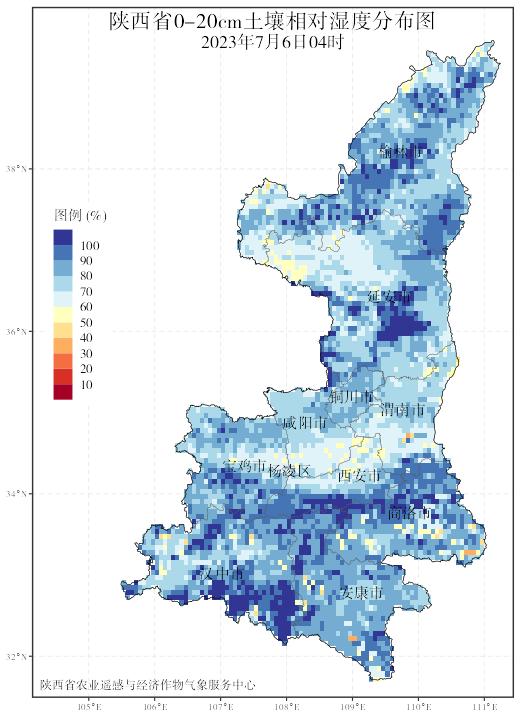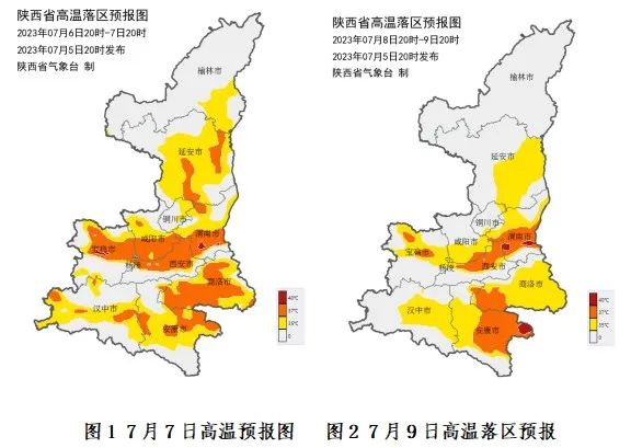 7日和9日关中、陕南大部有35~37℃的高温,宝鸡中部、咸阳南部、西安部分、渭南南部、杨凌、安康东部、商洛西部可达38~40℃。