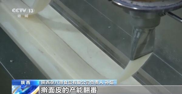 陕西杂八得食品有限公司负责人 孙煊:靠手工满足不了现在的消费需要,最主要是产能保障不了。现在擀面皮由生变熟依靠这个专利技术来实现,擀面皮的产能翻番,每分钟一台单机达到60公斤的产能。