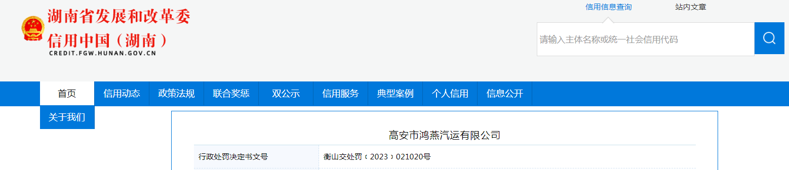 湖南省衡山县交通运输局对高安市鸿燕汽运有限公司作出行政处罚