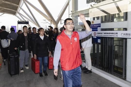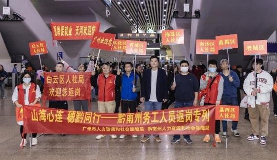 当天下午6点33分,广州首趟“山海心连 穗黔同行”返岗专列也搭乘了近600名贵州黔南籍务工人员抵穗,广州市人社部门还组织了专车,接送务工人员回天河、黄埔、白云、花都、增城、南沙等区,以备顺利返岗。