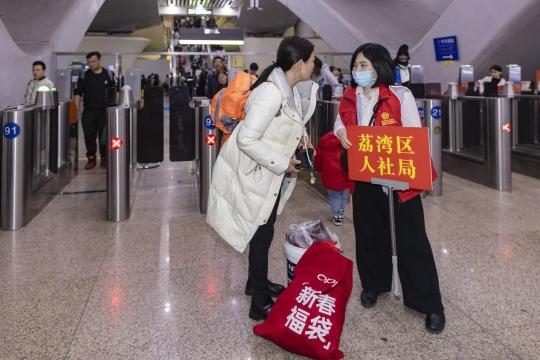 “欢迎贵州籍务工人员入粤!”大年初六的广州南站,返穗人员逐渐增多。下午5点13分,乘坐首趟东西部劳务协作免费返岗专列的600多名贵州籍务工人员从贵州遵义市桐梓东站出发,经过7个多小时路程,顺利到达广州南站。务工人员一下车,就接到广东省人社部门准备的糖果果仁礼包,还有“南粤春暖”海报,可以扫码查看2000多场招聘会信息以及“就业地图”。这些务工人员将回到广州、深圳、佛山、东莞等地工作。