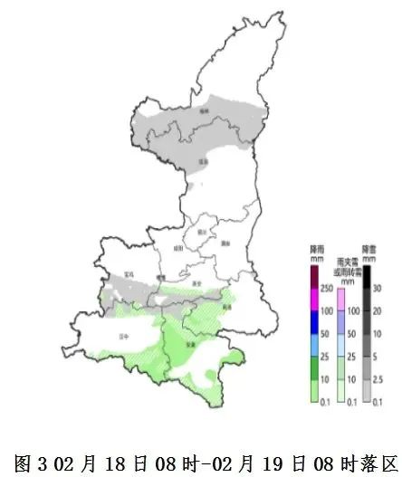 预计18日:陕北多云间阴天,关中多云间晴天,陕南阴天间多云。陕南部分地方有小雨(0.1~2毫米)。秦岭山区有雨夹雪或小雪(0.1~1毫米)(图3)。陕北、关中和商洛有5~6级偏北风,阵风 7级以上。陕北、关中部分地方有扬沙或浮尘,局地有沙尘暴。